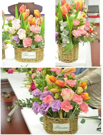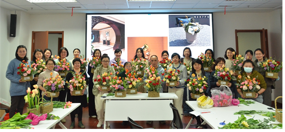 活动现场,龚老师深入浅出地介绍了鲜花品种、鲜花修剪等基础知识,讲授颜色搭配、造型手法等艺术插花技巧。大家一边附耳倾听,一边拿起花枝动手搭配,在活动现场欢乐的笑声中,一件件温馨的花艺作品也逐渐创作出来。花美人美笑容美,女教工们看着自己创作的艺术品,感到满满的成就感和幸福感。