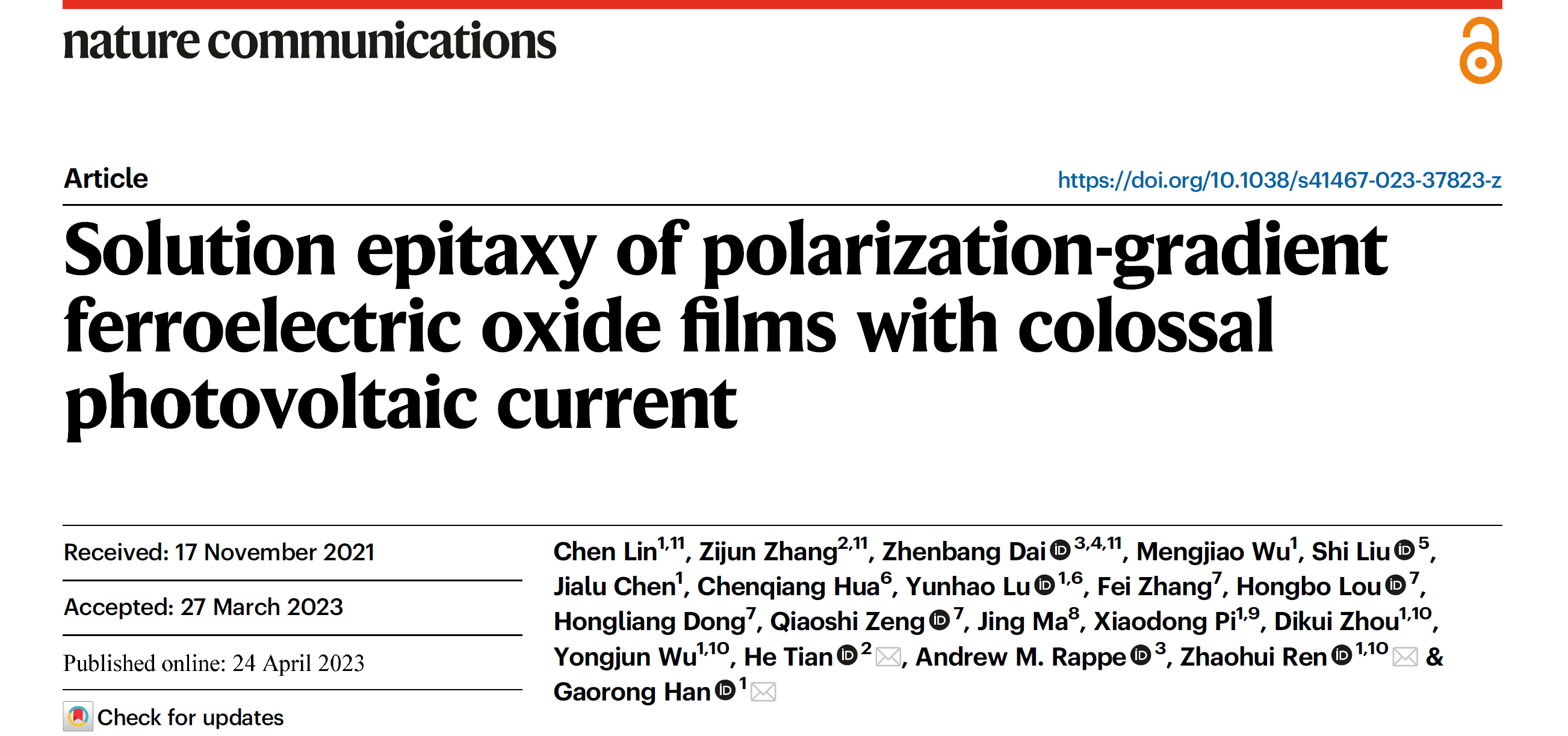近日,浙江大学材料学院韩高荣教授、任召辉副教授课题组联合田鹤教授课题组,在铁电氧化物单晶薄膜的溶液外延策略、生长机制与光电性能调控方向取得重要进展,相关工作以“Solution epitaxy of polarization-gradient ferroelectric oxide films with colossal photovoltaic current”为题发表在2023年4月24日出版的《Nature Communications》上。