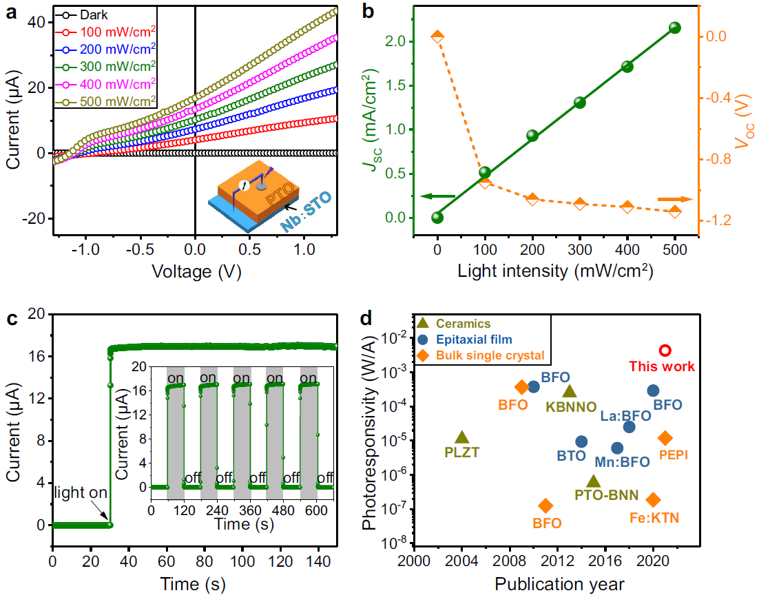 在这项工作中,研究团队发现,与传统气相外延的机制不同,界面晶格失配度并非低温外延生长的热力学主导因素;揭示了薄膜-衬底间的电子极化屏蔽在调控界面能和外延生长模式中的关键作用,提出了极化屏蔽驱动的铁电氧化物薄膜低温(100 oC-200oC)溶液外延新策略,解决了系列晶格失配度铁电氧化物低温外延的难题;获得PbTiO3、Pb(Zr,Ti)O3、BiFeO3等单畴、梯度结构铁电氧化物薄膜材料,并在这类梯度结构薄膜中发现了巨大的、可被极化方向调制的体光伏电流,其光响应度为目前铁电氧化物材料的最优值。