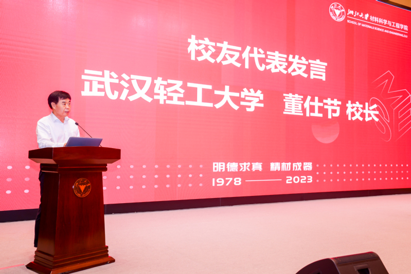武汉轻工大学校长董仕节教授作为校友代表发言。董仕节教授深切怀念过去在母院的求学岁月,对曾经教导过自己的师长和学院的无私栽培表示由衷的感谢,并对学院45年的发展感到骄傲和自豪。