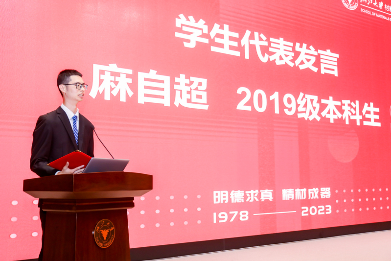 材料学院2019级本科生麻自超作为学生代表发言。麻自超同学感谢学院提供的广阔平台和优质资源,表示自己将铭记“浙大材料人”这一光荣称号,为社会贡献青春力量。