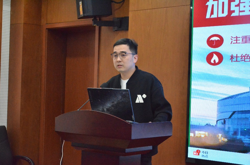 随后,浙江大学安全保卫处服务办公室副主任陈青老师为同学们带来了校园安全宣讲。陈老师首先为同学们科普了常见的非机动车交通知识以及常见安全隐患。接着,陈老师结合了两个电动自行车引发火灾的案例提醒同学们,要遵守“四个禁止”“两个强制”,做到“两个办法”。最后,陈老师呼吁同学们要预防火灾事故,了解“三懂”,做到“四会”,遵守“五不要”。