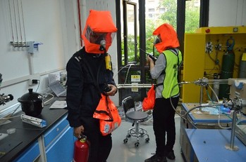 与此同时应急处置小组的两名成员,已在安全技术专家梅工的指导下穿戴好呼吸器具,佩戴好气体监测设备,手持灭火器,在警戒入口处做好信息登记后进入现场进行应急处置。进入后,一名队员排查泄露源迅速关闭气体阀门。另一名队员将门窗打开,确认安全情况后启动了实验室的应急排风。
