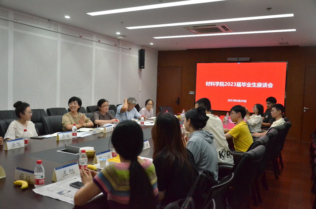 2023年6月29日中午,材料学院2023届毕业生座谈会在紫金港校区材2-217会议室召开。材料学院党委书记王晓燕、副院长程逵、党委副书记王育萍、学工办主任李由、教学科老师王艳华、教学科老师林卓清与14位2023届本、研毕业生代表齐聚一堂,共话在浙江大学材料学院学习拼搏的奋斗往事,畅想未来的发展规划。座谈会由李由老师主持。