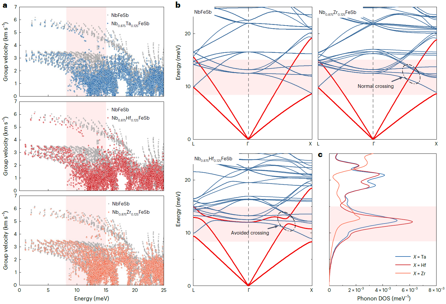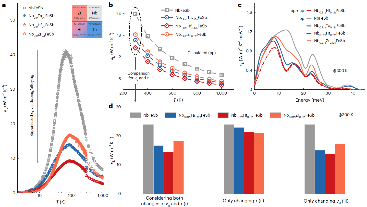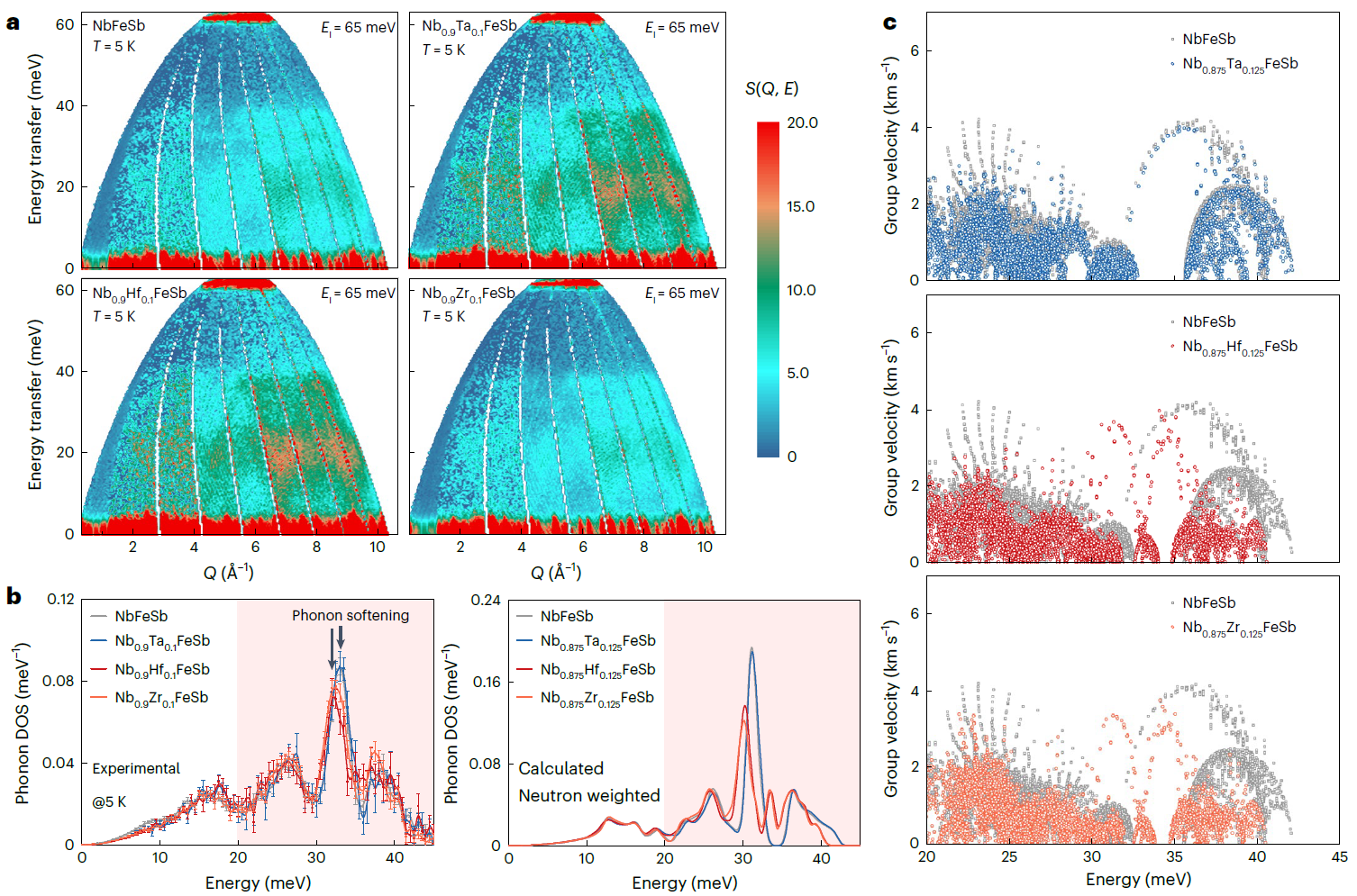 研究团队对典型热电材料体系中异价掺杂和共电子合金化对晶格热导率影响的实验数据进行对比分析,发现相较于共电子合金化这一广为使用的晶格热导率抑制策略,相同剂量的异价掺杂对热电半导体晶格热导率的抑制更为显著(图1b)。具有更大态密度有效质量的重带热电材料需要更大的异价掺杂浓度实现电性能优化,因而可以作为研究异价掺杂对声子输运作用机制的理想材料载体。研究团队选择目前半赫斯勒合金中P型性能最优的NbFeSb基重带热电材料作为研究对象,分别进行10%浓度的异价掺杂和共电子合金化,测试全温度范围的晶格热导率并与第一性原理计算结果进行交互对比分析。实验结果表明仅10%的异价掺杂在室温下就可以实现65%的晶格热导率抑制,而要实现同样的晶格热导率抑制所需要的共电子合金化含量需高达40%。进一步的计算结果显示该抑制作用源自异价掺杂带来的声子群速度的下降(图2)。
