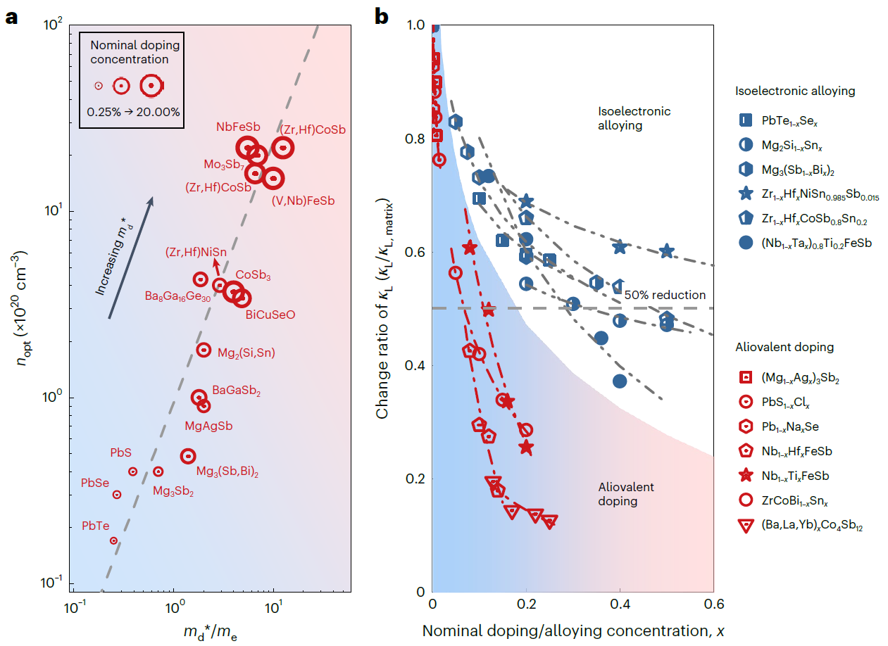 1 a)典型热电材料的优化载流子浓度与有效质量关系,(b)异价掺杂和共电子合金化对典型热电材料晶格热导率影响分析