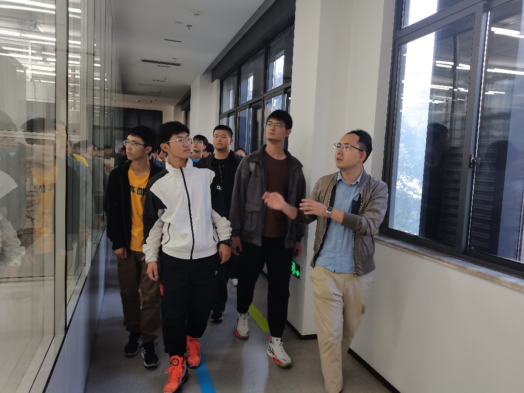 然后,在韩学峰老师的带领下师生们参观了先进半导体研究院。该研究院以宽禁带半导体材料、功率芯片和射频芯片的研发与产业化为核心,以封装测试和应用技术作为服务支撑,是国内唯一的全链条开放式宽禁带半导体材料、器件及应用创新高能级科研平台。同学们陆续参观了封装测试区、单晶加工区、单晶生长区,了解封装测试、碳化硅外延、干法刻蚀、湿法刻蚀等材料制备方法计算模拟与实验相结合的研究方法。此外,同学们还学习了超宽禁带半导体材料的相关知识。同学们初次接触到大型的仪器设备,充满了对半导体行业的好奇,纷纷表示对在实验室里完成科研任务的渴望。