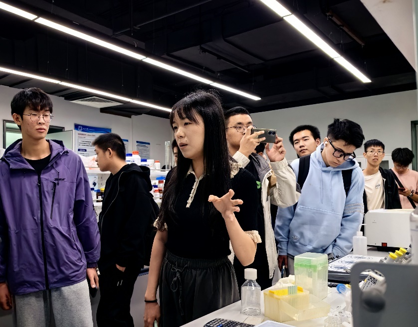 接着,在生物与分子智造研究院的实验室中,陈佳菲学姐向同学们介绍道,该实验室建设初心是通过对自然生命和天然分子的认知,利用合成生物学和分子智造, 创造人工合成体系,来重构人工生命和功能分子,实现建物致知-认识自我、建物致用-服务自身这两大目的,从而推动多个领域的颠覆性技术创新。之后,陈学姐就自身研究方向——肿瘤治疗材料——展开解释,从医药学和材料学两个角度展现生物材料的魅力,使同学们更进一步体会到学科交叉的科研优势和科创中心这一平台的难得可贵。