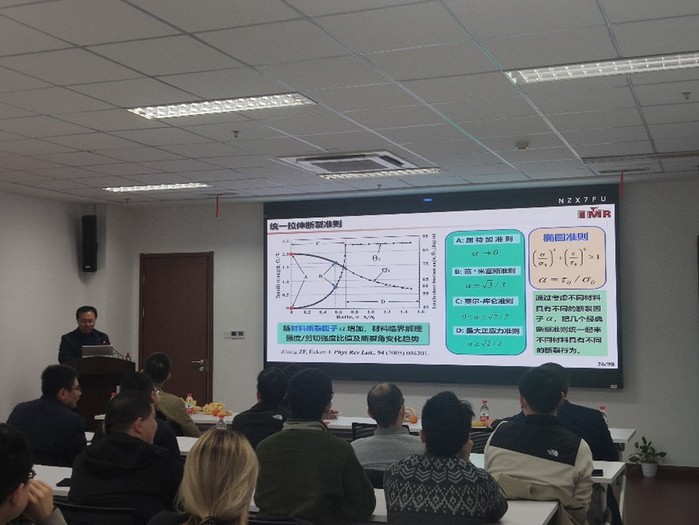 张哲峰研究员精彩的演讲主要包括两个主要部分:金属玻璃的统一拉伸断裂准则和延性金属的指数加工硬化模型。首先,张哲峰研究员就泰坦尼克号因船体断裂沉没事件引出高强度金属材料的必要性。对金属而言,实际理论强度与实验理论强度相差了近1000倍,Taylor等人提出了位错模型解决了这个问题。同时介绍了经典脆性断裂理论(1638-1913年),但随着科学前沿的发展,非晶合金的断裂却不符合经典理论,非晶合金的拉伸断裂角度大于45°,压缩断裂角度小于45°,张哲峰研究员查阅文献经过试验后得出如下结论:拉伸正应力对剪切断裂具有促进作用,压缩正应力对剪切断裂具有抑制作用。张哲峰研究员在此基础上开创性地提出椭圆准则统一了经典强度理论公式,提出材料断裂因子α=τ0/σ0,并给出断裂因子α的基本定义:材料纯剪切强度与解理强度的比值。其中纯剪切强度和解理强度是材料两个独立的力学性能参数。