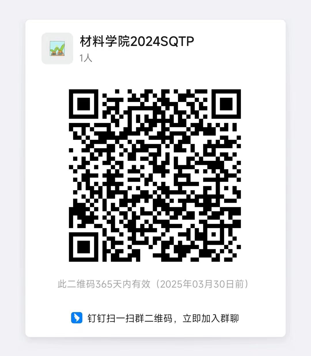 项目启动:2024年度SQTP项目于4月启动。请各团队将《浙江大学学生素质训练(SQTP)项目立项可行性报告和申请表》(附件2)和SQTP立项项目汇总表(附件3)并于4月17日前发送至邮箱zjumse_tw@163.com。邮件名称统一命名“2024材料学院+SQTP+团队负责人姓名”。 请各团队负责人在发送邮件后扫描下方二维码进入钉钉群聊,学院将通过群聊平台通知后续立项工作事宜,立项答辩初步定于4月18日晚,请各团队做好准备。