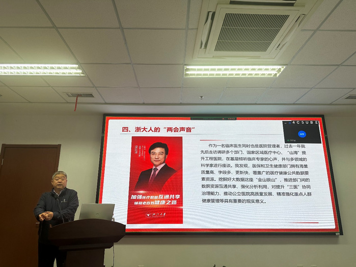 程逵老师从两会简介、政府工作报告、2024全国两会新词热词、浙大人的“两会声音”四个方面进行了分享,就扩大内需、深化改革、医疗保障等热点问题展开了热烈的讨论。报告指出,过去一年,是全面贯彻党的二十大精神的开局之年,是本届政府依法履职的第一年。 报告还指出要“大力推进现代化产业体系建设,加快发展新质生产力。”程老师分析了新三样热词和材料学科之间的联系,结合产业化改造、光伏半导体、锂电电机等内容。最后,程老师向同学们介绍了参与两会的五位浙大人,心怀“国之大者”,立足人民群众的实际需求,积极发挥好自身优势,切实发现问题并推动解决问题。