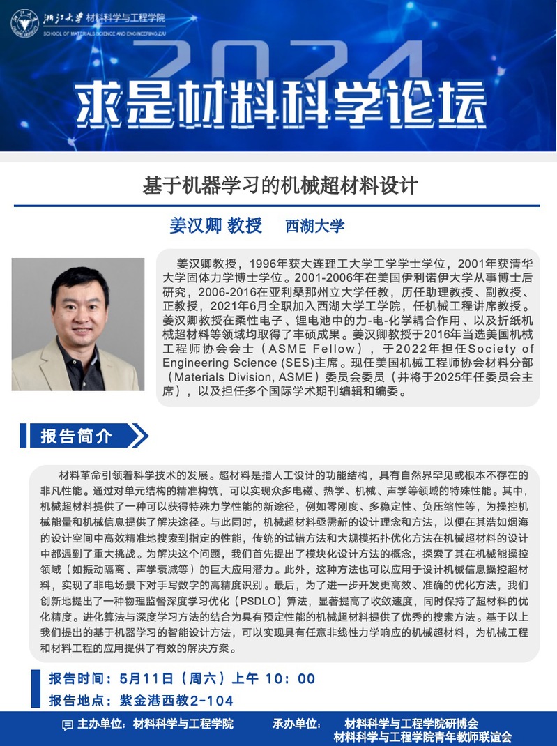 【求是材料科学论坛】2024年7期:关于西湖大学姜汉卿教授报告会的通知