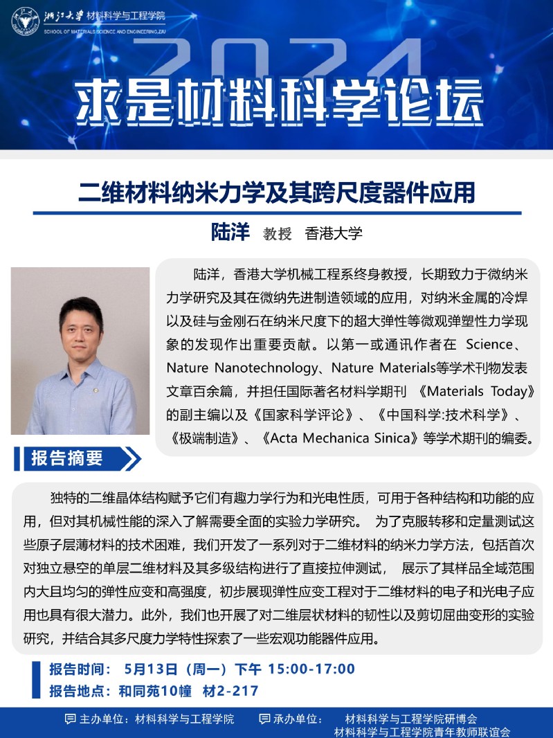 【求是材料科学论坛】2024年8期:关于香港大学陆洋教授报告会的通知