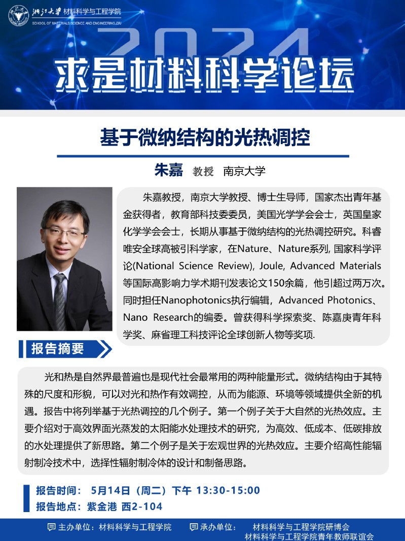 【求是材料科学论坛】2024年9期:关于南京大学朱嘉教授报告会的通知