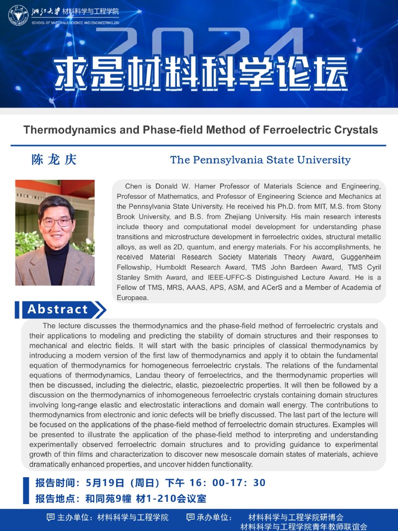 【求是材料科学论坛】2024年11期:关于美国宾州州立大学Prof. Chen Longqing报告会的通知