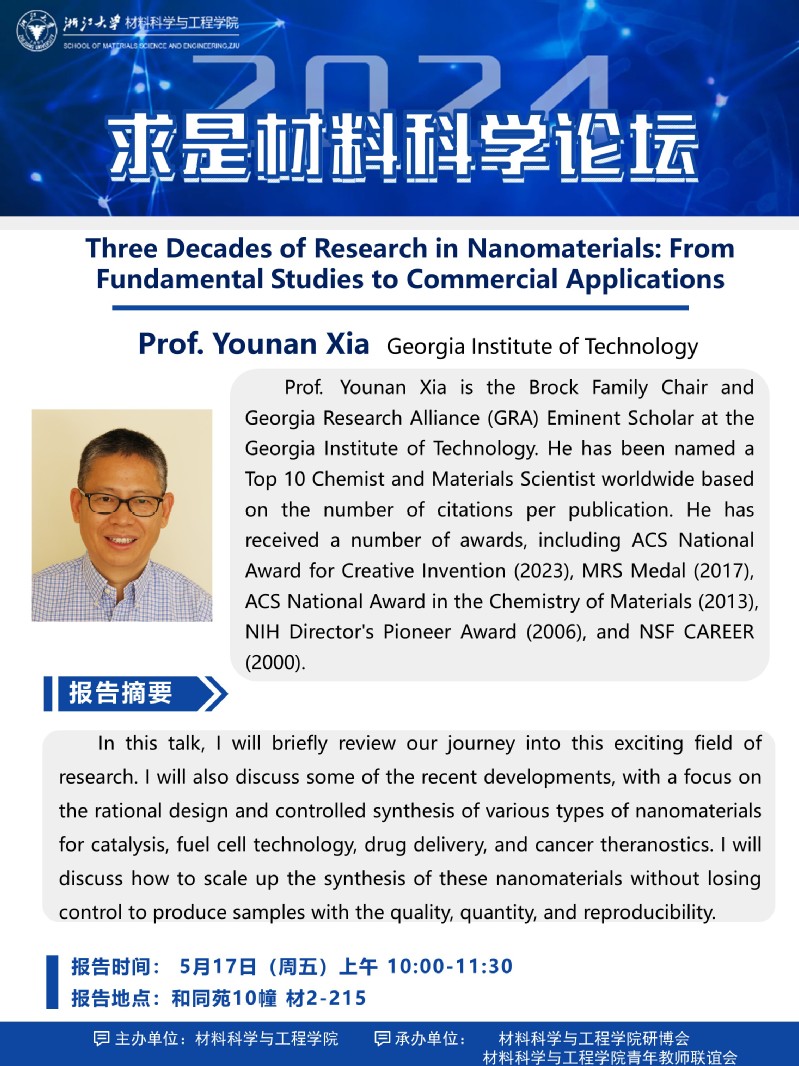 【求是材料科学论坛】2024年12期:关于美国佐治亚理工学院夏幼南教授报告会的通知