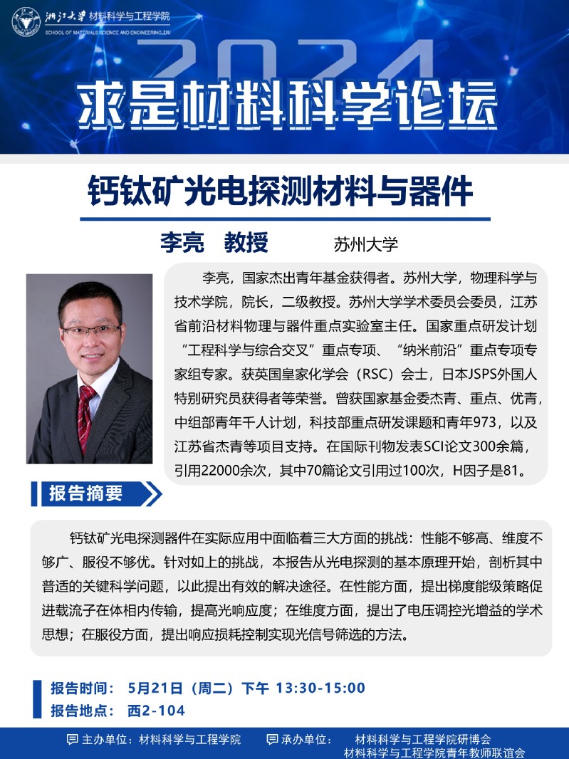 【求是材料科学论坛】2024年13期:关于苏州大学李亮教授报告会的通知