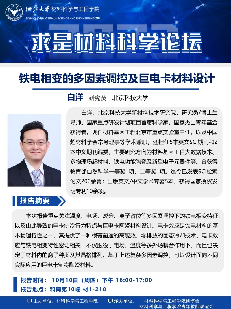 【求是材料科学论坛】2024年19期:关于北京科技大学白洋研究员报告会的通知