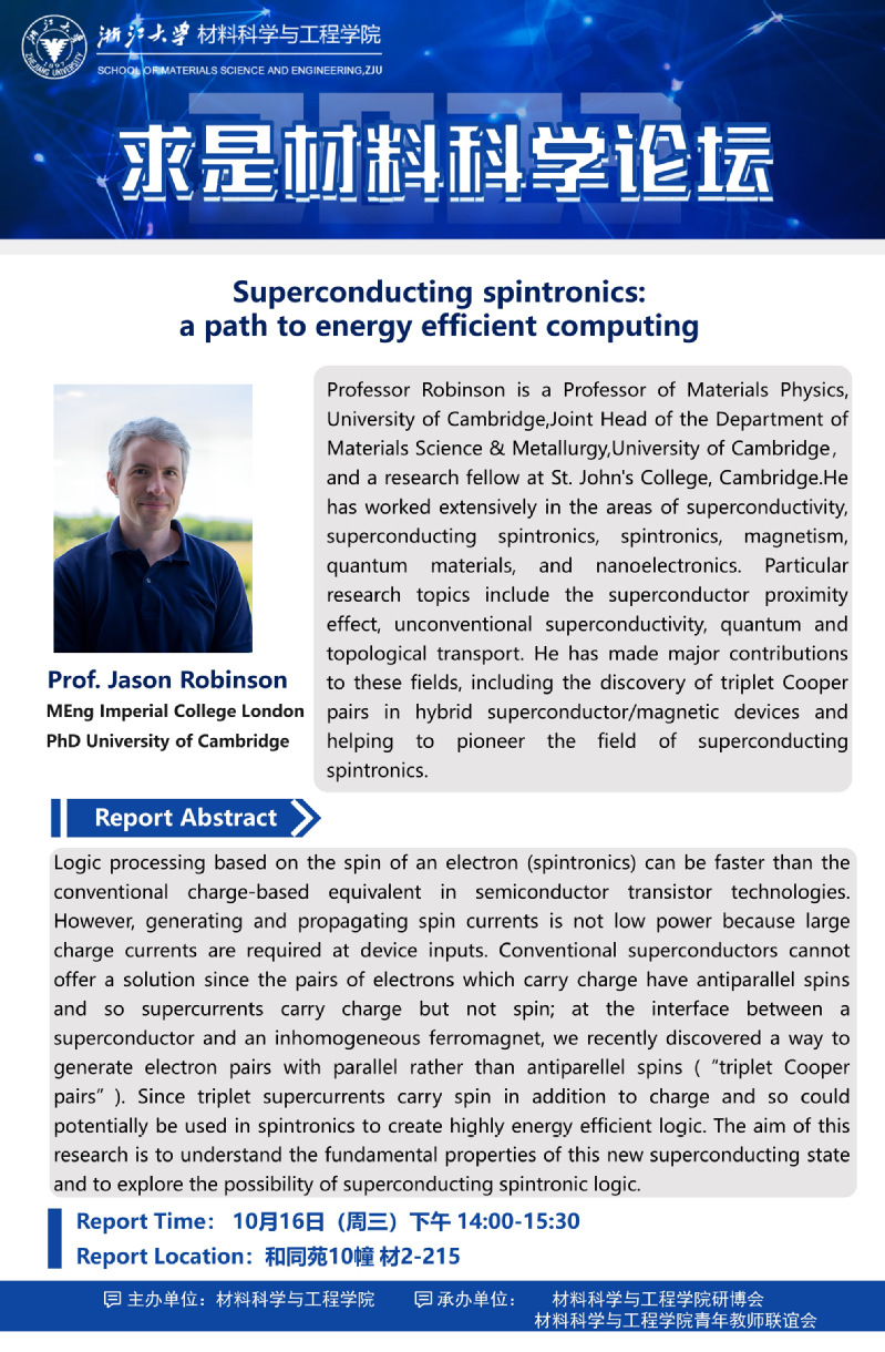 【求是材料科学论坛】2024年20期:关于剑桥大学Prof. Jason Robinson报告会的通知