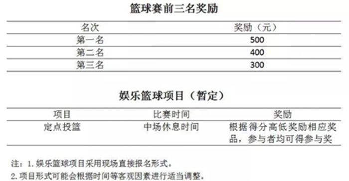 3.奖励:比赛对前三名队伍进行奖励,娱乐篮球项目及比赛奖励办法如下图所示。