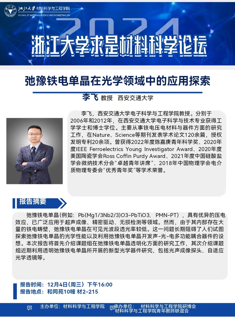 【求是材料科学论坛】2024年24期:关于西安交通大学李飞教授报告会的通知