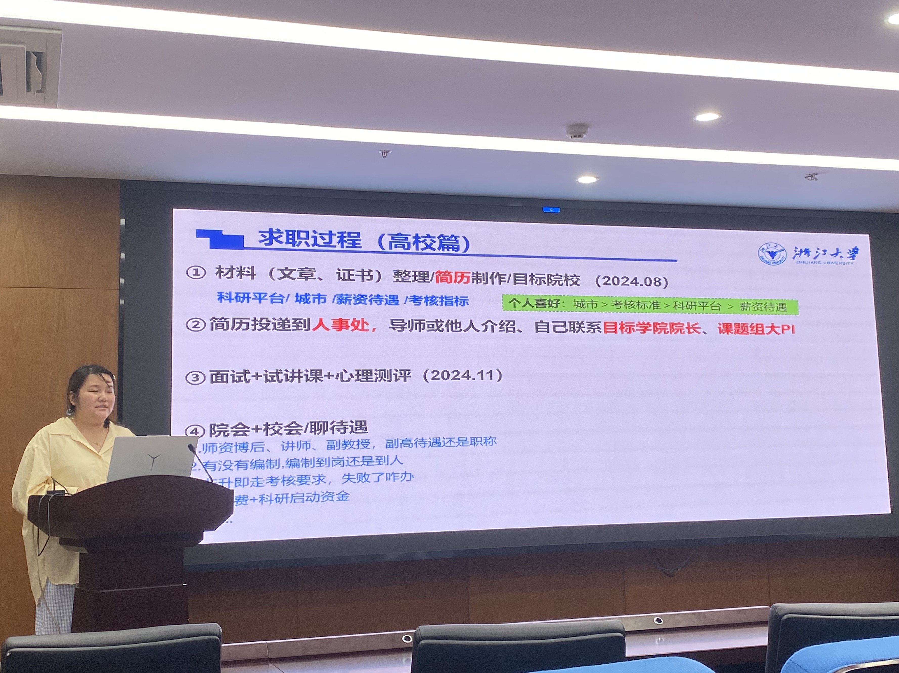 首先,李欣同学分享了自己职业选择的心路历程,并详解了高校和企业求职全流程,为大家提供了清晰的求职思路和方法。她剖析了自己在考公务员、进入高校、加入企业三种主要路径间权衡抉择的思考过程,包括自己的价值观、个人能力、兴趣,以及想去的城市、扎根的可能性、工作强度和发展前景等因素,并提醒大家要尽早明确求职目标。李欣同学根据自己的求职过程,详细给出了高校求职的每个步骤以及需要注意的问题,包括套磁信的书写要点、试讲时应该给出的教学规划、面试问题集锦和考查关键、入职前需要问清的问题等。同学们认真听讲,不时记录下关键信息。在企业求职详解中,她还分享了通过笔试和性格测试的技巧。李欣同学用自己所拿到的offer激励大家:要相信认真准备,会有好结果的。分享结束,掌声四起,大家纷纷感动于师姐一个小时的倾囊相授。