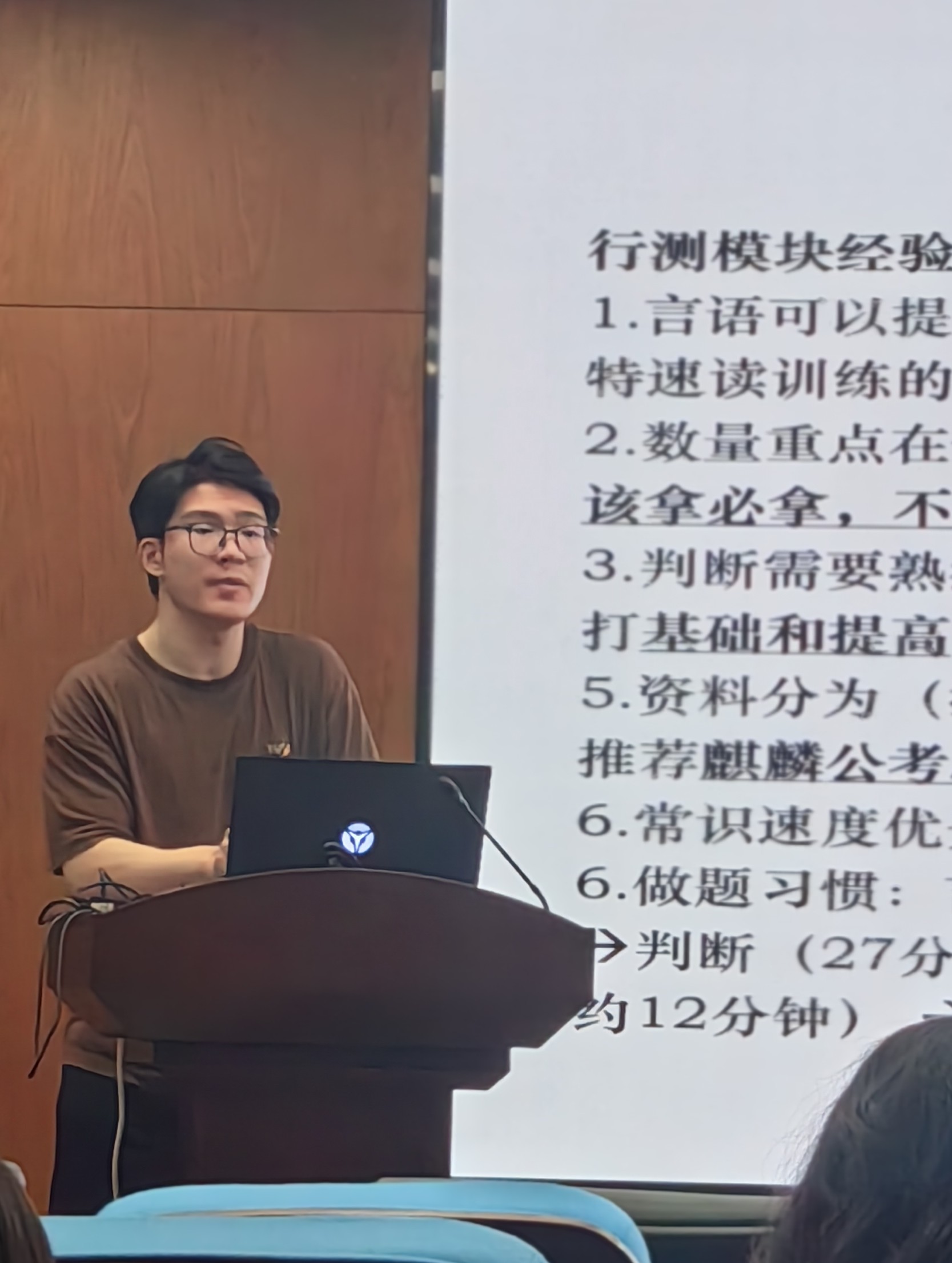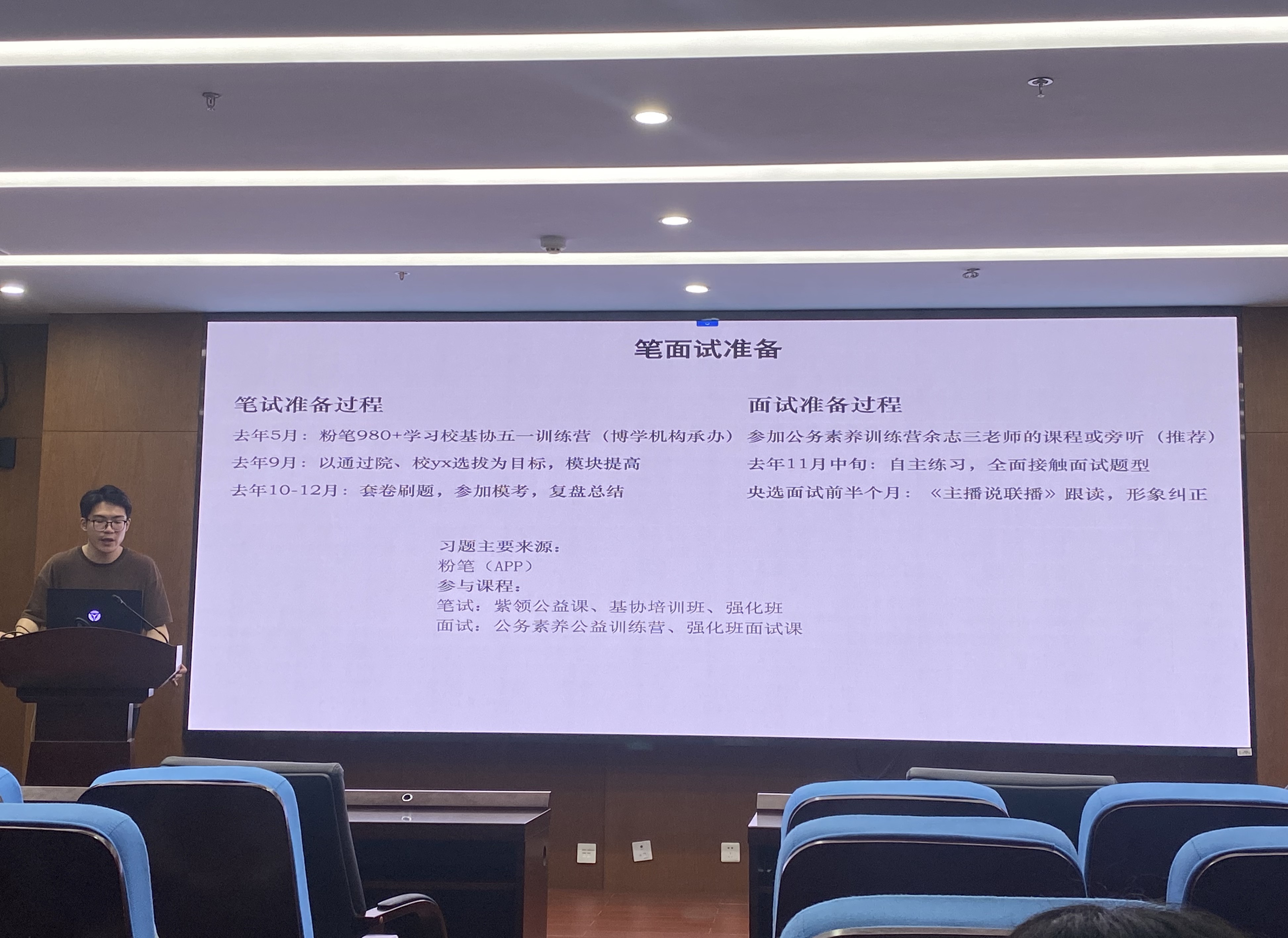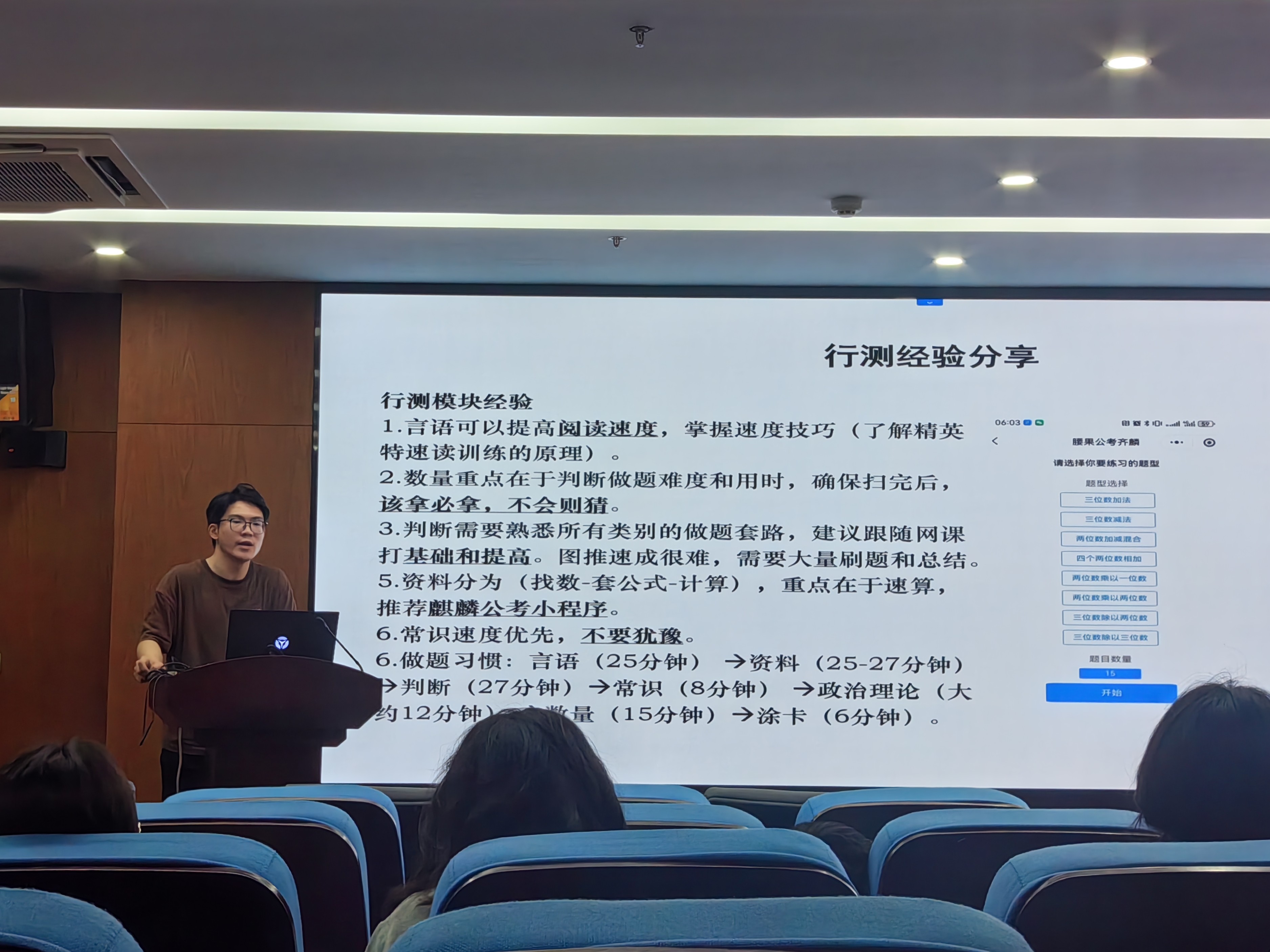 接着,周麟铭同学重点分享了选调生的备考经验。他分享了进行政务实习的一些渠道,包括彩虹人生平台、学校暑期实践平台、公管学院展翅计划等,并鼓励大家充分利用校内资源,丰富课余生活,全面提升个人素质。周麟铭同学也结合自身经验,讲述了自己在行测各模块题目的时间分配、做题顺序、取舍技巧,并推荐了一些有帮助的小程序和公众号。周麟铭同学还强调了与优秀前辈交流的重要性,前辈的眼界、优秀品质和信息资源都是非常值得我们认真学习的,我们应该勇敢地主动联系优秀同学,与他们为伴,向他们学习。大家表示,这些建议给了很多启发,对未来的成长和择业就业非常有帮助。
