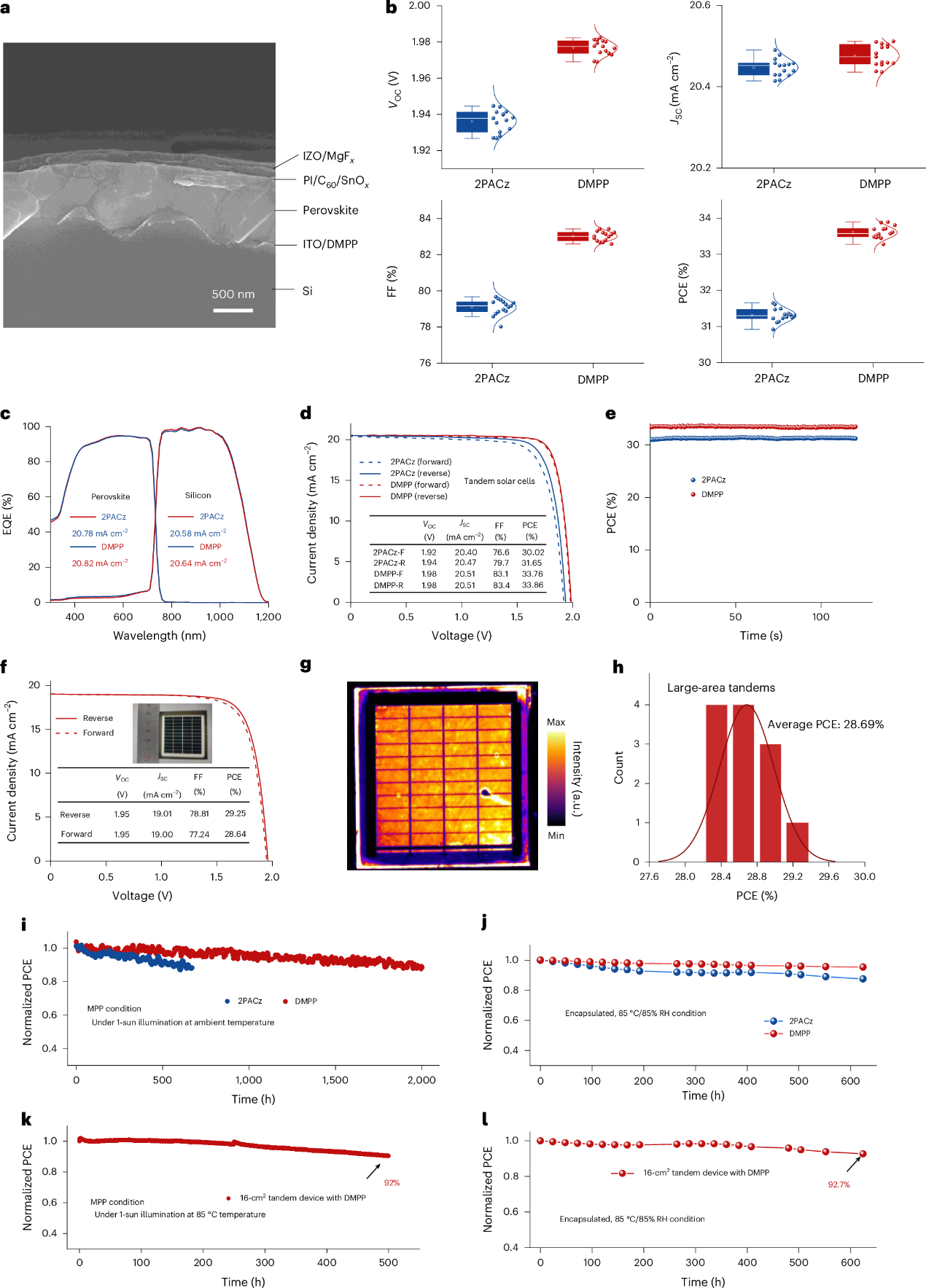 通过精确调控SAM分子堆积及其与钙钛矿的相互作用,实现钙钛矿与SAM基底在结构与能级上的双重兼容,研究团队将DMPP运用到硅基钙钛矿叠层电池中,在1cm2的硅基钙钛矿叠层器件中获得了33.86%的效率。在进一步扩大面积后,在16cm2的面积上获得29.25%的效率。并且在室温、双85条件下均获得优异的稳定性。