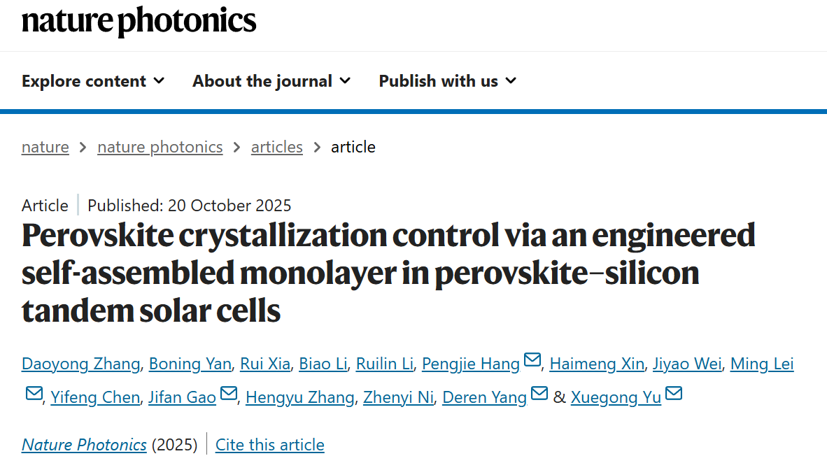 该项研究成果于北京时间20251020日,被国际著名期刊《自然·光子学》在线刊登。通讯作者为浙江大学杨德仁院士、余学功教授、雷鸣教授、杭鹏杰专职研究员、天合光能高纪凡。浙江大学为该论文的第一单位。