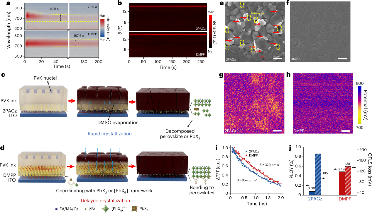 研究团队通过原位XRD和原位PL表征DMPP调控钙钛矿的结晶过程,阻断诱发缺陷的结晶通道,实现卤素均匀化的可控钙钛矿生长,消除纳米孔洞与PbI相偏析,确定了DMPP可以实现钙钛矿与SAM基底在结构与能级上的双重兼容性。