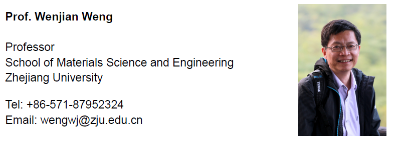 The group is leaded by Wenjian Weng (wengwj@zju.edu.cn). He was promoted as a full professor in Zhejiang University in 1997. He was Head or Vice Head of Department of Materials Science and Engineering in 2001-2013. Recently, more than 10 projects in the National Natural Foundation of China, the National High Technology Research and Development Program of China, and the Research Fund of Science and Technology Department of Zhejiang Province have been carried out as Principle Investigator. Up to now, he has more than 200 SCI papers, more than 50 granted invention patents.
