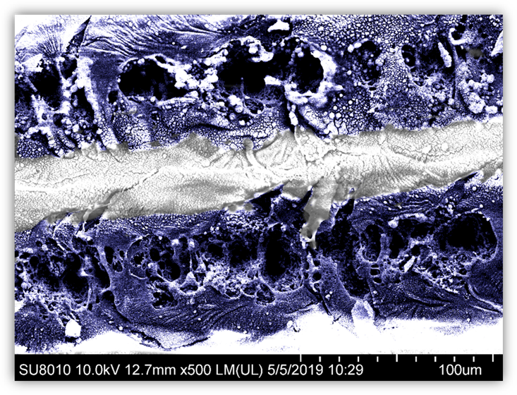 The PDMS substrate under the microscope is like waves rising and falling, one right after the other. The ship rides on the wind and breaks the waves, leaving a trail of courageous progress. In the pursuit of truth on the road of scientific research, we may meet some troubles, but we will go forward in spite of the hardships and will eventually reach the ideal shore.