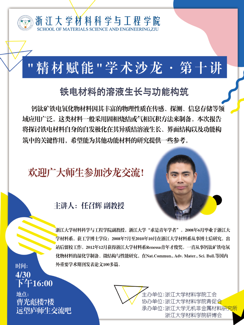 Dr. Ren received his Ph.D. from Materials Science and Engineering at Zhejiang University in 2008. After a postdoc for two years at Zhejiang University from 2008 to 2010, he joined School of Materials Science and Engineering, Zhejiang University in 2010 as an assistant professor, and then promoted to an associate professor in 2013. During this period, he visited MMK and Arrhenius Laboratory at Stockholm University, Sweden. His research interest focuses on low-dimensional ferroelectric materials, and organic-inorganic composites for sensors and photocatalytic applications. He has published more than 100 peer reviewed journal articles (including Nat. Commu. Adv.Mater. JACS and Angew. Chem. Int. Ed. etc.), and held more than granted 20 patents. These publications have been cited for over 1600 times with H-index of 24.